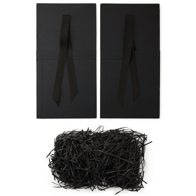 - Pack of 2 black gift boxes with black ribbon trim includes a 1.5 oz bag of coordinating paper shred.