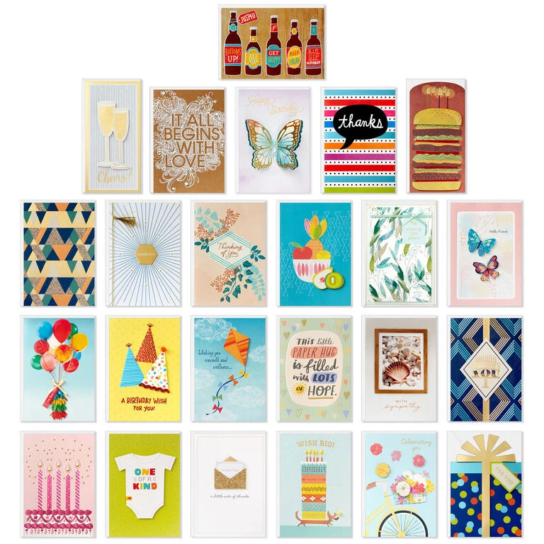 Champagne flutes design: Cheers!; Time to raise a toast for two…Here’s to love! Here’s to you! Happy anniversary. - Box includes 24 assorted cards and envelopes: 8 birthday, 3 celebrate, 2 thank-you, 2 wedding/anniversary, 1 get well, 2 sympathy, 2 thinking-of-you, 1 baby, 1 encouragement, 1 friendship, 1 blank.