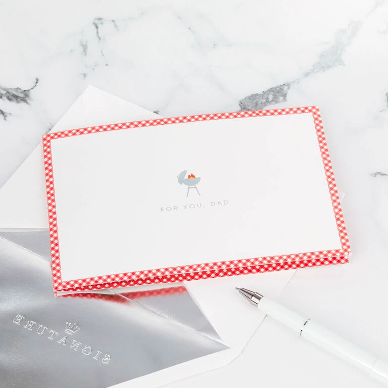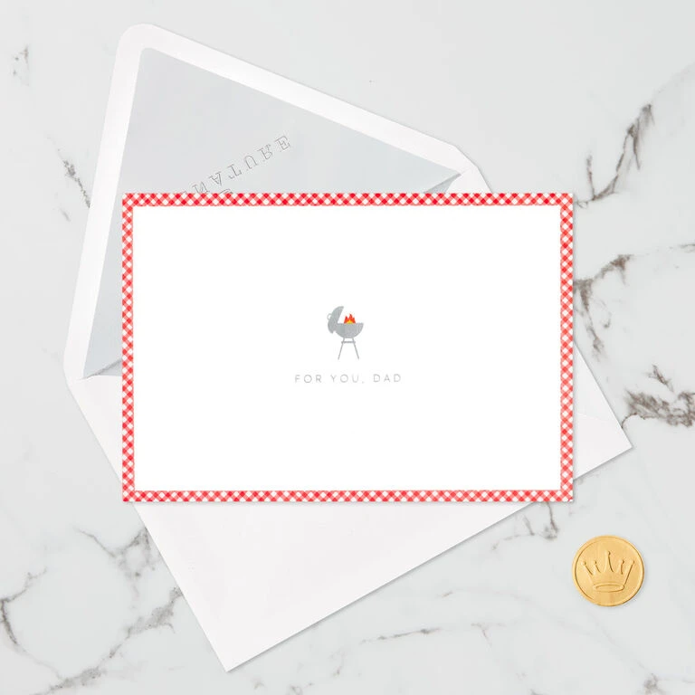 Pop-up Father’s Day greeting card features a grill icon with silver foil accents, red checkered border and a message for your dad. Simply open the card to reveal the 3D pop-up surprise inside—no assembly required: an intricate, laser-cut barbeque grill with faux flames, die-cut utensils and a bucket of cold beverages pops out. Shiny silver foil accents add to the fun. This unique card crafted from premium card stock is a work of art sure to be displayed all year long, making it an unforgettable way to celebrate dad’s day. When open, this pop-up card lays flat for display; 3D pop-up inside measures approx. 5.5″ H.