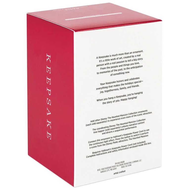 - Key Features: Connect the Interactive Light and Sound ornament to Hallmark’s Keepsake Power Cord (sold separately) to see the continuous light effect. Press the button to watch it perform a scene from the Disney Parks attraction, The Haunted Mansion. Add other Disney The Haunted Mansion Collection ornaments to experience even more of the iconic attraction. The coordinating Disney The Haunted Mansion Collection tree topper unlocks narrative content and directs a sequential performance.