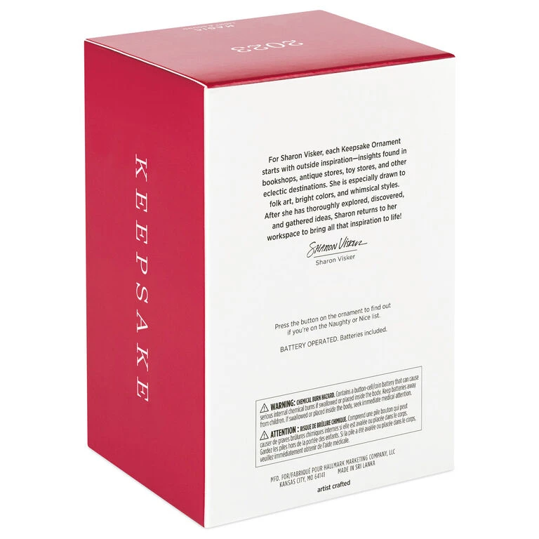 Have you been naughty or nice this year? Santa knows! And he’s ready to impart your Christmas-morning fortune with this playful Christmas tree ornament. Press the button to see the vintage carnival game design light up and hear if Santa thinks you have been good enough for presents this holiday season (battery-operated).