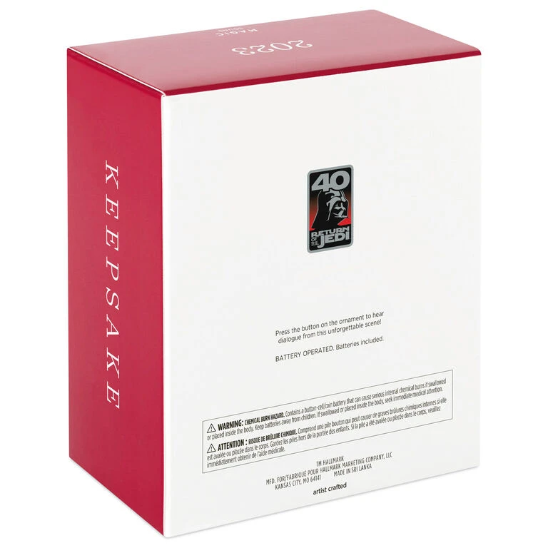 Jabba the Hutt used his luxury sail barge to visit Tatooine’s Sarlacc pit, where Han Solo, Luke Skywalker and Chewbacca were to be publicly executed. This Christmas tree ornament depicts that massive transport, the Khetanna, from Star Wars: Return of the Jedi. Press the button on the ornament to play audio from the unforgettable scene (battery-operated).