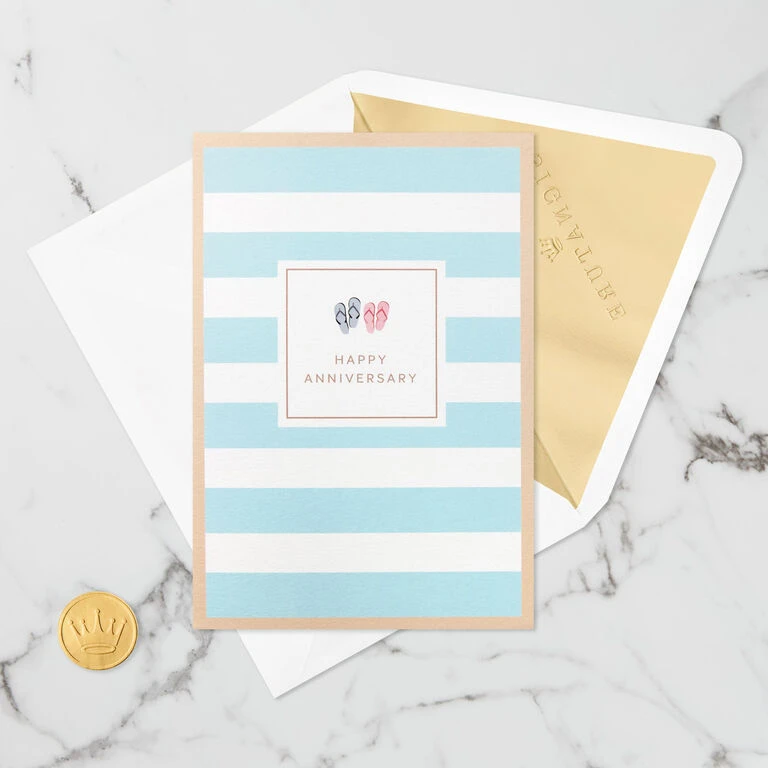 Pop-up anniversary greeting card features colorful flip-flops and sky-blue stripes paired with a “Happy Anniversary” message on the front. Simply open the card to reveal the 3D pop-up surprise inside—no assembly required: a beach vacation scene pops out filled with intricate, laser-cut lounge chairs, a striped umbrella, palm trees and tropical drinks. Die-cut details and sparkly glitter accents add a fun touch. This exquisite card crafted from premium card stock is a work of art sure to be displayed all year long, making it an unforgettable way to share your love on your anniversary or send happy anniversary wishes to a special couple. When open, this pop-up card lays flat for display; 3D pop-up inside measures approx. 3.25″ H.