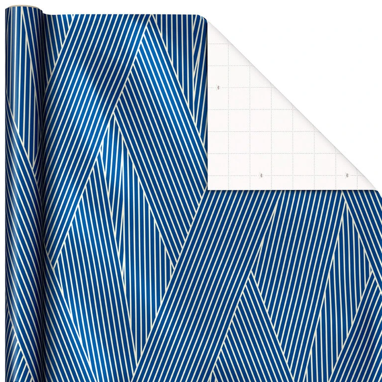 - Pack includes 2 standard wrapping paper rolls (layered blue stripes and gold dots on cream) plus 1 holographic roll with metallic gold accents (snowflakes on teal).